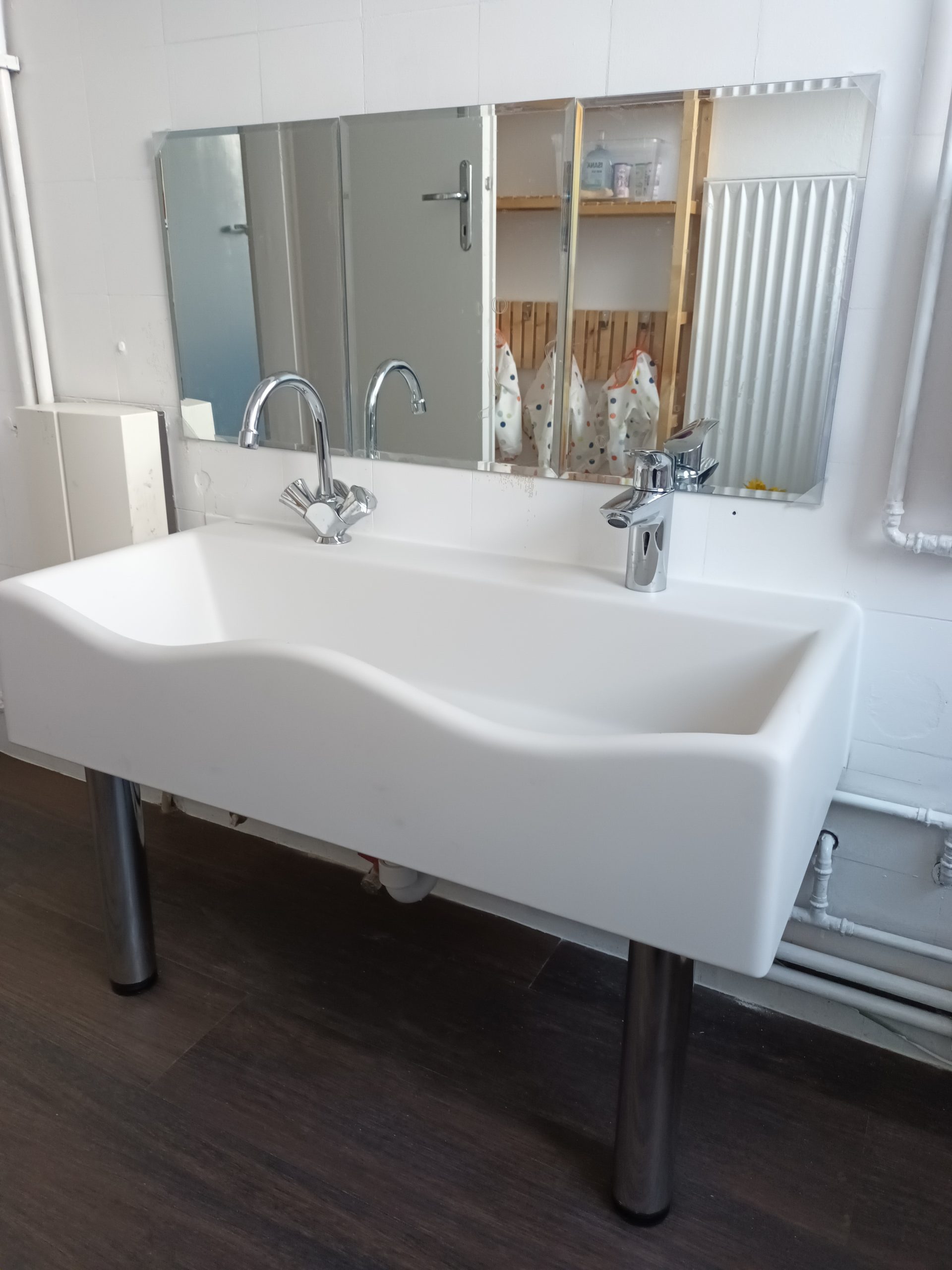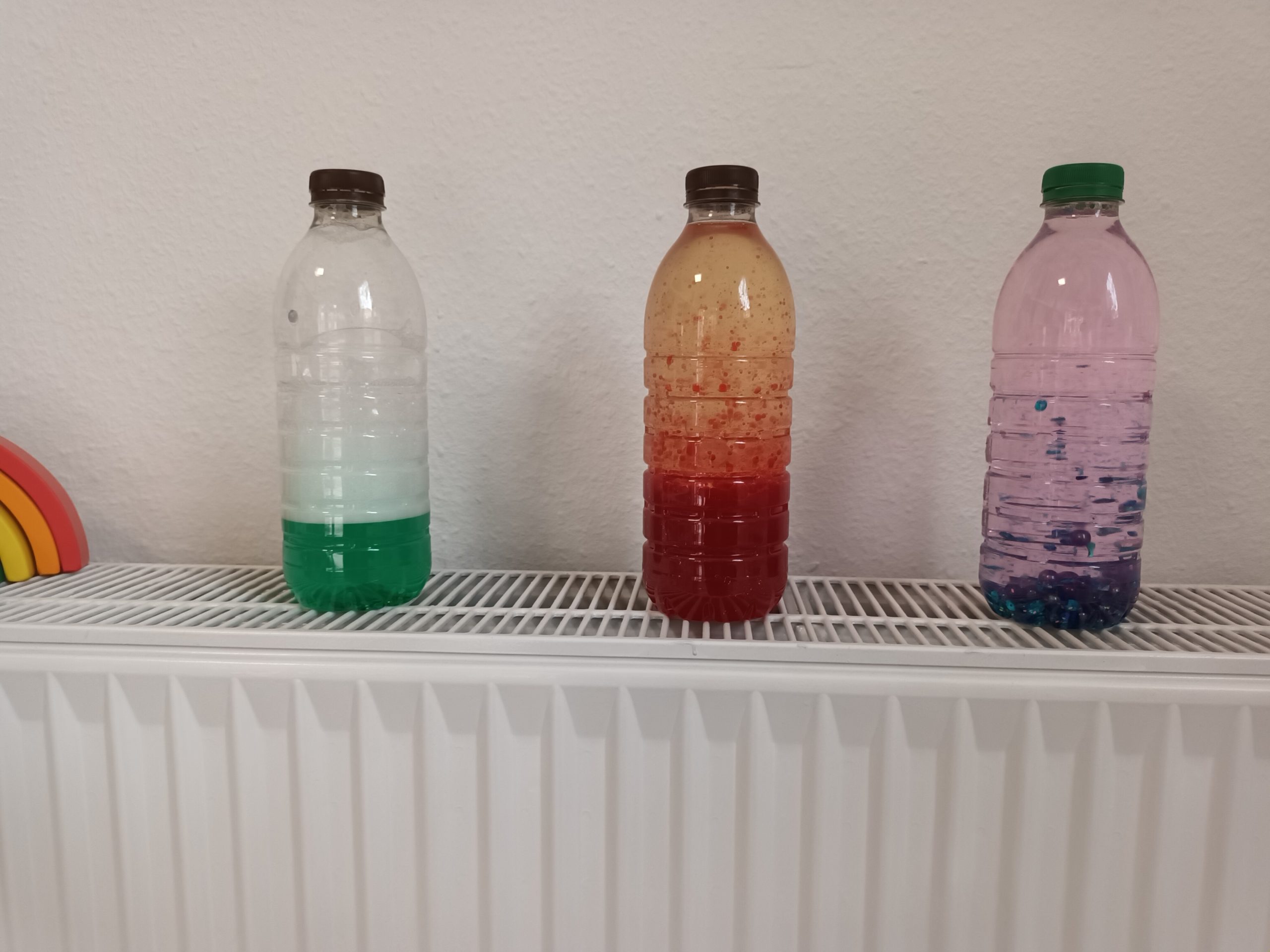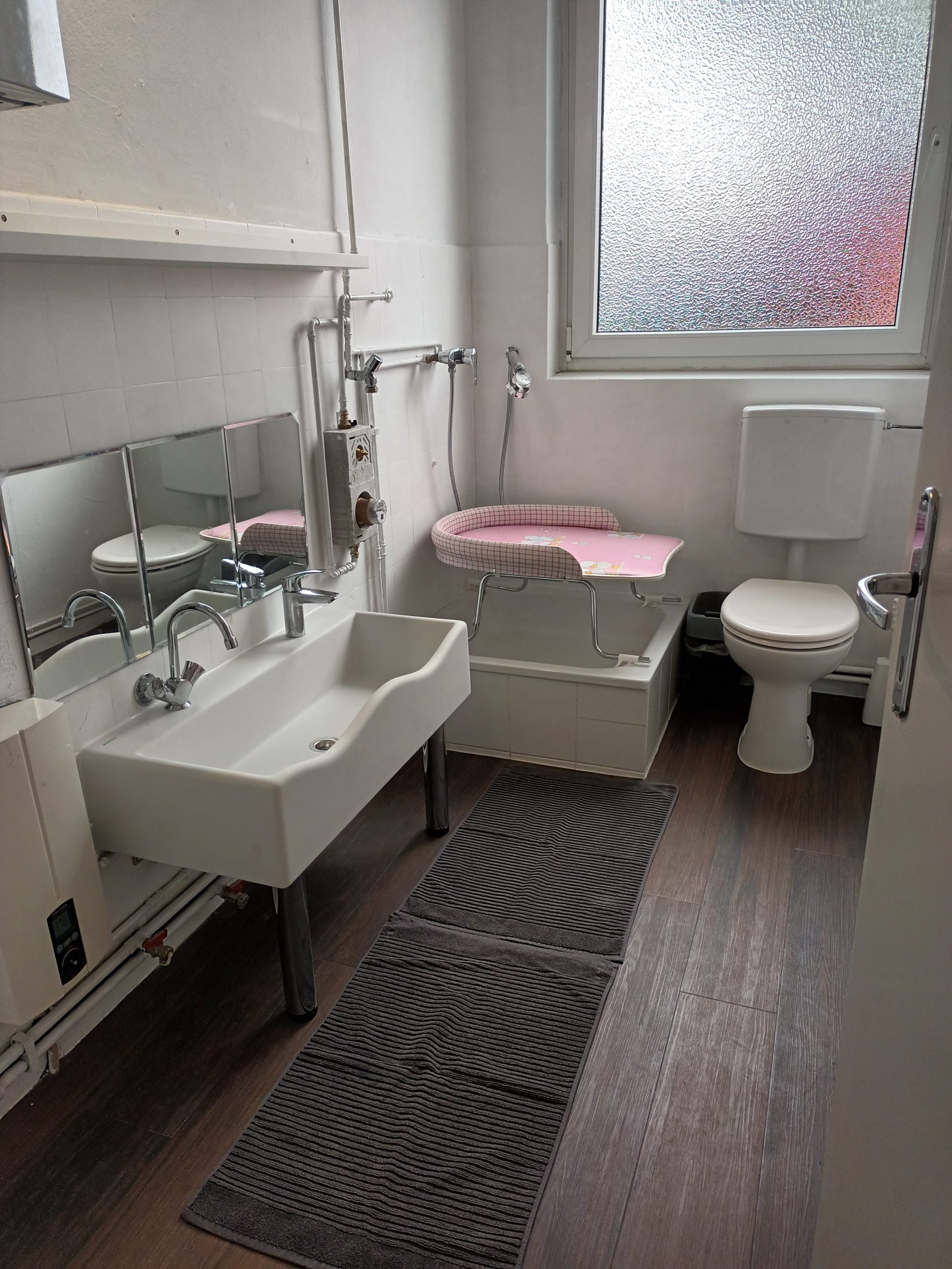 Der Waschraum ist eher klein und fein. Er verfügt über einen kindgerechten Waschtisch mit zwei unterschiedlichen Armaturen. Selbst beim Händewaschen können die Kinder ihre feinmotorischen Fertigkeiten erproben und ausbauen. Hier können wir auch unsere Wasserpartys veranstalten 🙂