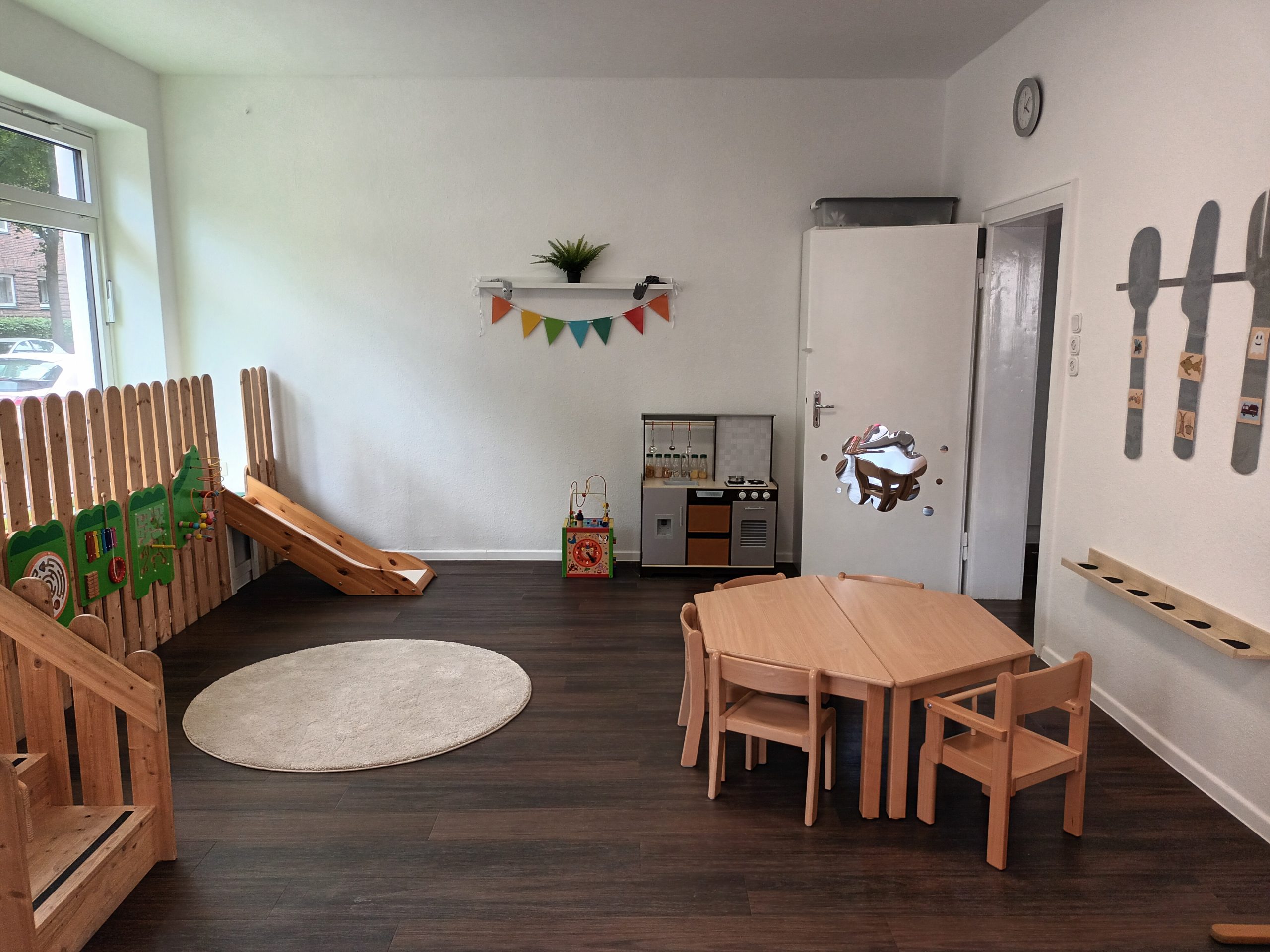 Im großen Gruppenraum befindet sich eine Hochebene mit einer Rutsche. Die Fenster werden je nach Jahreszeit oder Ideen der Kinder gestaltet. Außerdem stehen unterschiedlichste Spielzeuge und Alltagsmaterialien zum Erkunden zur Verfügung. Der runde Teppich ist unser Treffpunkt für den Morgenkreis, aber natürlich ebenso unsere Sammelstelle für andere Anlässe.