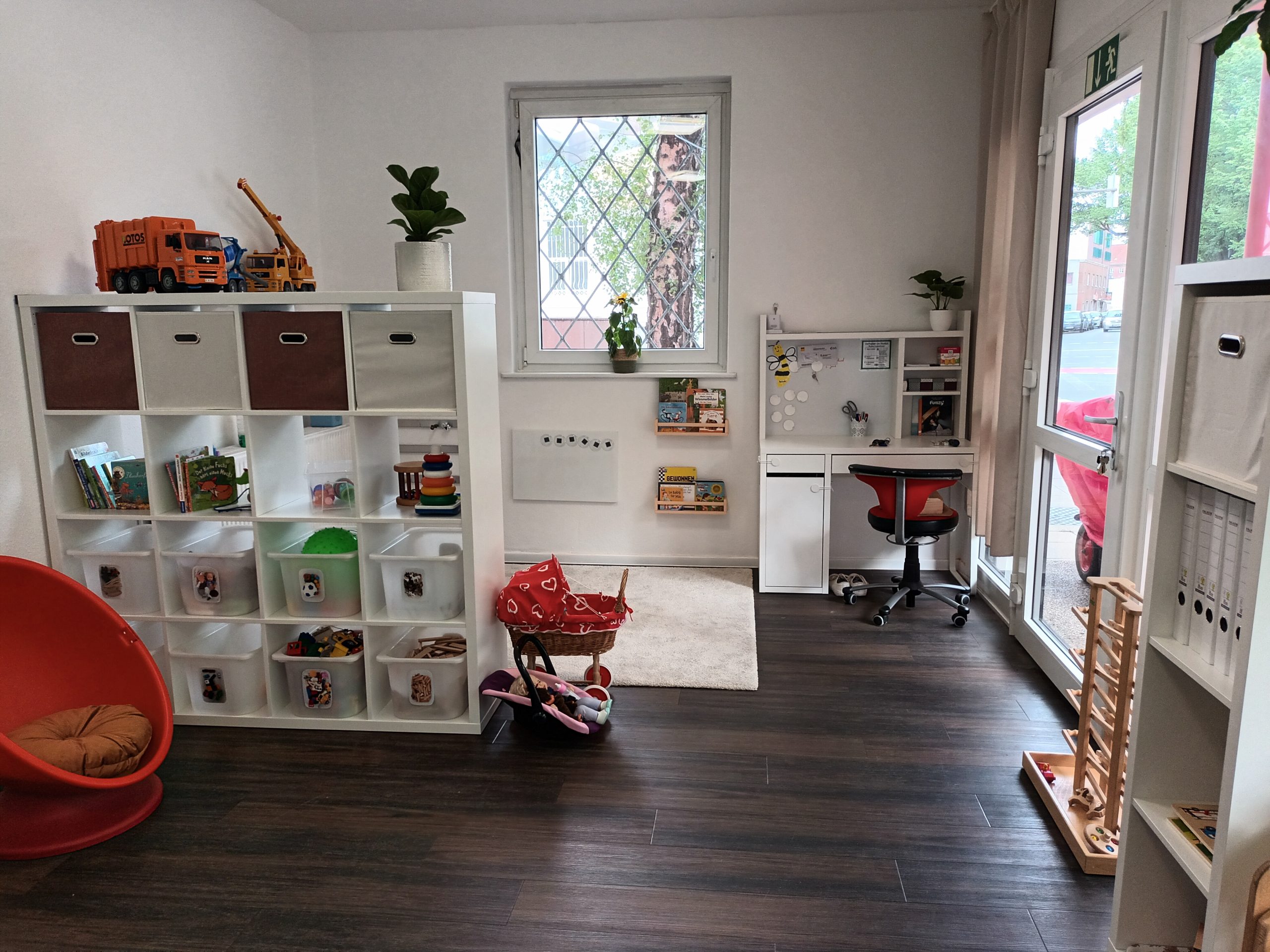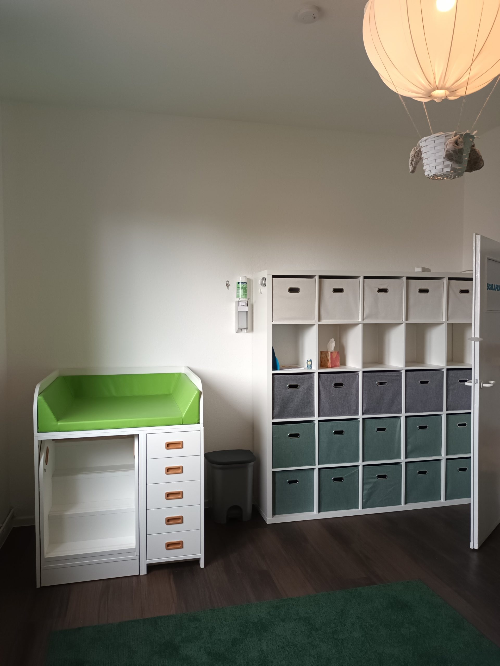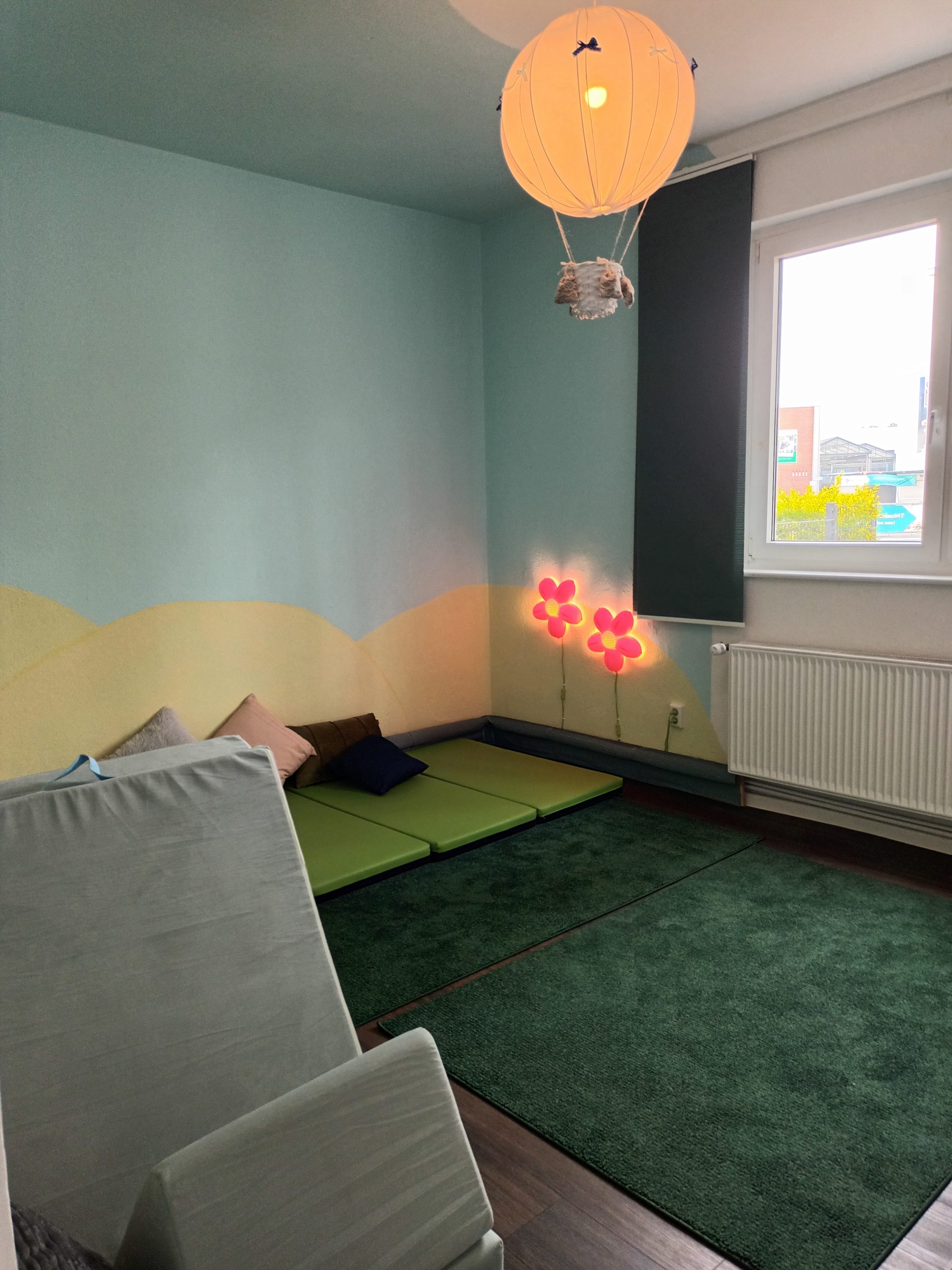 Der Schlafraum ist geräumig und unser Funzy Spielsofa lädt hier zum Toben ein. Das Sofa kann umgebaut werden als Kuschelhöhle, aber auch als Rakete oder kleine Bewegungslandschaft, ganz wie es die Kinder gerade brauchen… Außerdem befindet sich hier auch unser Wickelbereich.