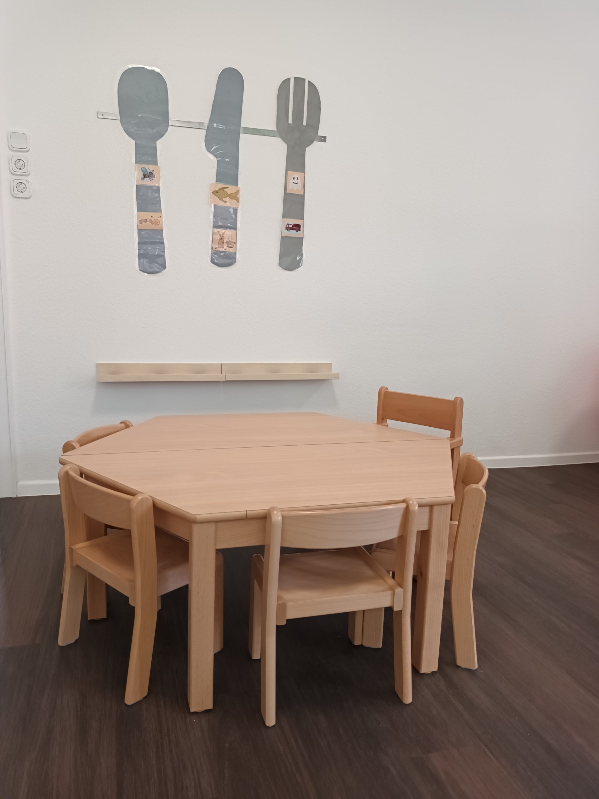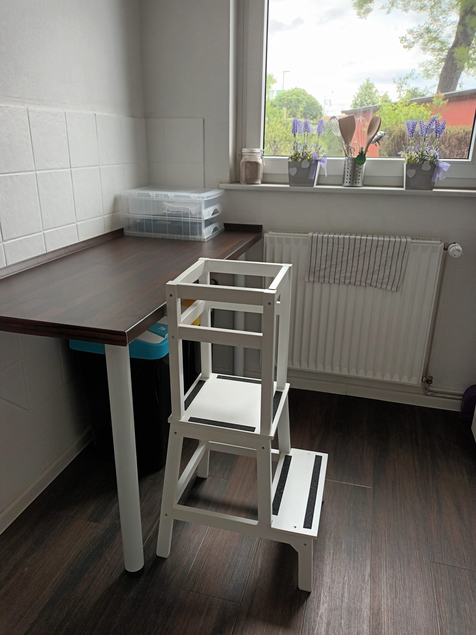 In der Küche dürfen sich die Kinder nicht alleine aufhalten. Es gibt dort aber einen Lernturm, so können einzelne Kinder auch an der Arbeitsplatte sicher stehen und mithelfen beim Backen oder vorbereiten der Mahlzeiten. Zur Sicherheit ist der Herd mit einem Gitter versehen und auch die Tür ist mit einem Türschutzgitter gesichert.